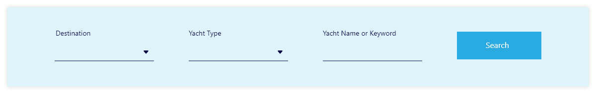 Find Your Yacht2025-01-22T16:47:32+00:00 Find Your Yacht Home > Find Your Yacht Destination Select Destination Caribbean Virgin Islands (BVI) Caribbean Virgin Islands (US) Caribbean Virgin Islands (US/BVI) Bahamas St Maarten, Anguilla & St Barts St Vincent & The Grenadines Belize French Polynesia Croatia Greece Turkey Indian Ocean & SE Asia W. Med - Spain/Balearics W. Med - Naples/Sicily W. Med - Riviera/Cors./Sard USA - Annapolis USA - California USA - Florida East Coast USA - Florida West Coast USA - Great Lakes USA - New England USA - North East USA - South East Start Date End Date Number of Guest Select No. of Guests 1 2 3 4 5 6 7 8 9 10 11 12 Yacht Type Select Yacht Type All Yachts All Catamarans Sailing Catamarans Power Catamarans Sailing Monohulls Motor Yachts Budget Budget $20,000 $30,000 $40,000 $50,000 $60,000 $70,000 $80,000 $100,000 $150,000 $200,000 + Filters Destination Select Destination Caribbean Virgin Islands (BVI) Caribbean Virgin Islands (US) Caribbean Virgin Islands (US/BVI) Bahamas St Maarten, Anguilla & St Barts St Vincent & The Grenadines Belize French Polynesia Croatia Greece Turkey Indian Ocean & SE Asia W. Med - Spain/Balearics W. Med - Naples/Sicily W. Med - Riviera/Cors./Sard USA - Annapolis USA - California USA - Florida East Coast USA - Florida West Coast USA - Great Lakes USA - New England USA - North East USA - South East Start Date End Date Number of Guest Select No. of Guests 1 2 3 4 5 6 7 8 9 10 11 12 Yacht Type Select Yacht Type All Yachts All Catamarans Sailing Catamarans Power Catamarans Sailing Monohulls Motor Yachts Budget Budget $20,000 $30,000 $40,000 $50,000 $60,000 $70,000 $80,000 $100,000 $150,000 $200,000 + Clear Search Your Search Results YACHT NAME HERE Location 10 | With oy without a captain From $500 per day YACHT NAME HERE Location 10 | With oy without a captain From $500 per day YACHT NAME HERE Location 10 | With oy without a captain From $500 per day View More